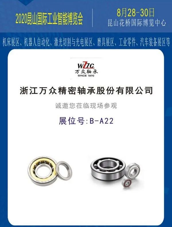 2020昆山國際工業(yè)智能展覽會暨2020昆山機械與智能制造展覽會將于2020年8月28日至30日在昆山花橋國際博覽中心舉行,浙江萬眾精密軸承股份有限公司(即萬馬軸承生產(chǎn)基地)也應邀參展,展位設在B號館A22,敬請廣大客戶朋友前來參觀洽談!